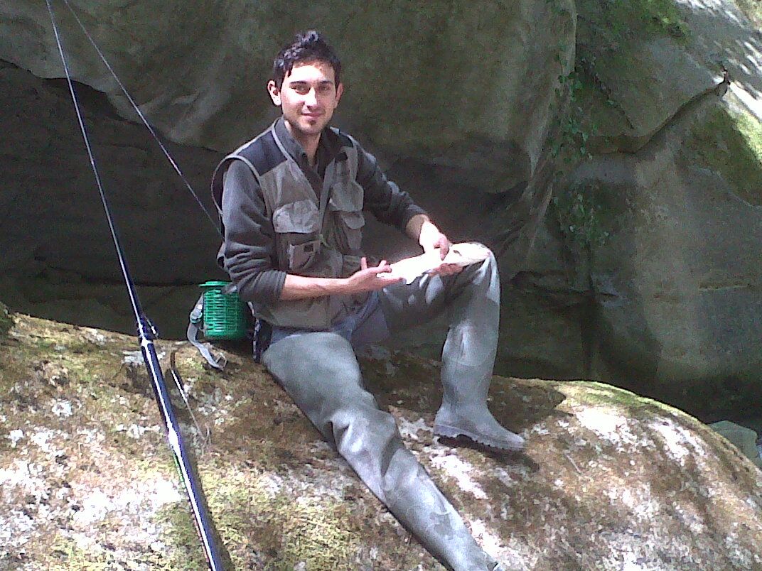 La fotoc che segue poi fu seguita da tante risate e dalla consapevolezza che era l’ultimo pesce della giornata, visto che ormai era tardi, stavo pescando a cavallo di una roccia che divideva il corso del fiume da una canalizzazione naturale che finiva sotto ad un masso gigante, non esito di più, col pallettone innescato due camole del miele tuffo la lenza in quel gorgoglio d’acqua; una ferrata pesante e la frizione che parte… ci siamo!