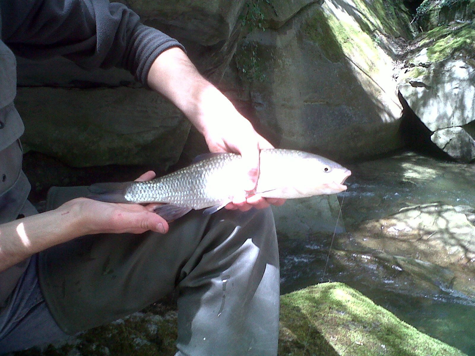 IMG00046-20120428-1045Il fiume si articola con correntine molto violente che finiscono con una cascata di grande o lieve intensità e questo si ripete per tutta o quasi la lunghezza del corso d’acqua, è fatto diciamo a scaletta e quindi anche gli spostamenti sono impegnativi. Dai miei ricordi fotografici ho in mente quando, con la canna legata sulla schiena, mi impegnavo a salire sempre di più il fiume e quando pensavo che era la buca giusta mi fermavo per dare due “toccate” al fondale.