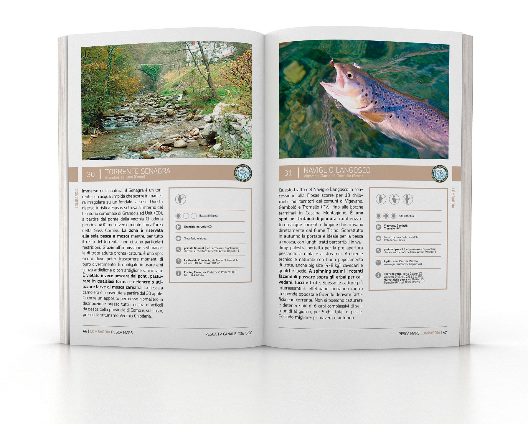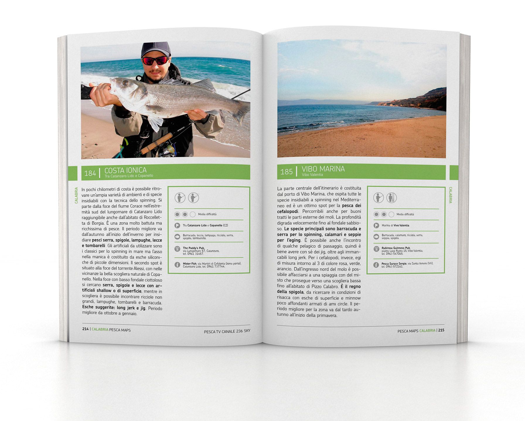Da leggere a casa ma anche da tenere in macchina pronta per essere consultata, la guida contiene pratici box per ogni meta indicata con le informazioni per raggiungere il luogo, il livello di difficoltà, e le tecniche di pesca che si possono praticare, per esempio dalla riva o dalla barca.